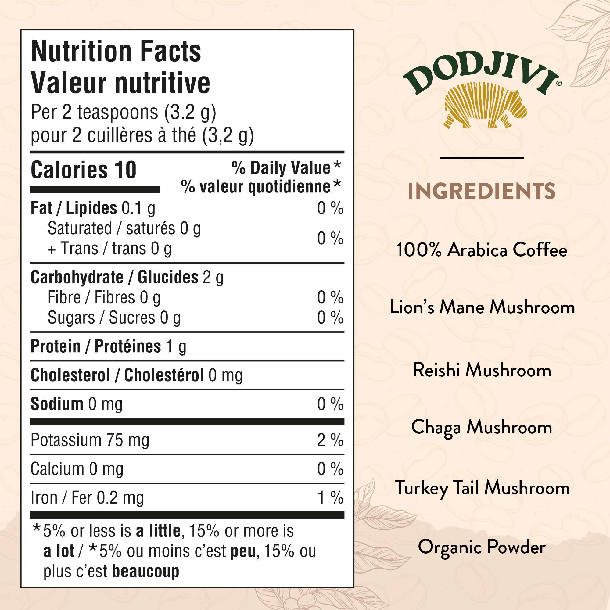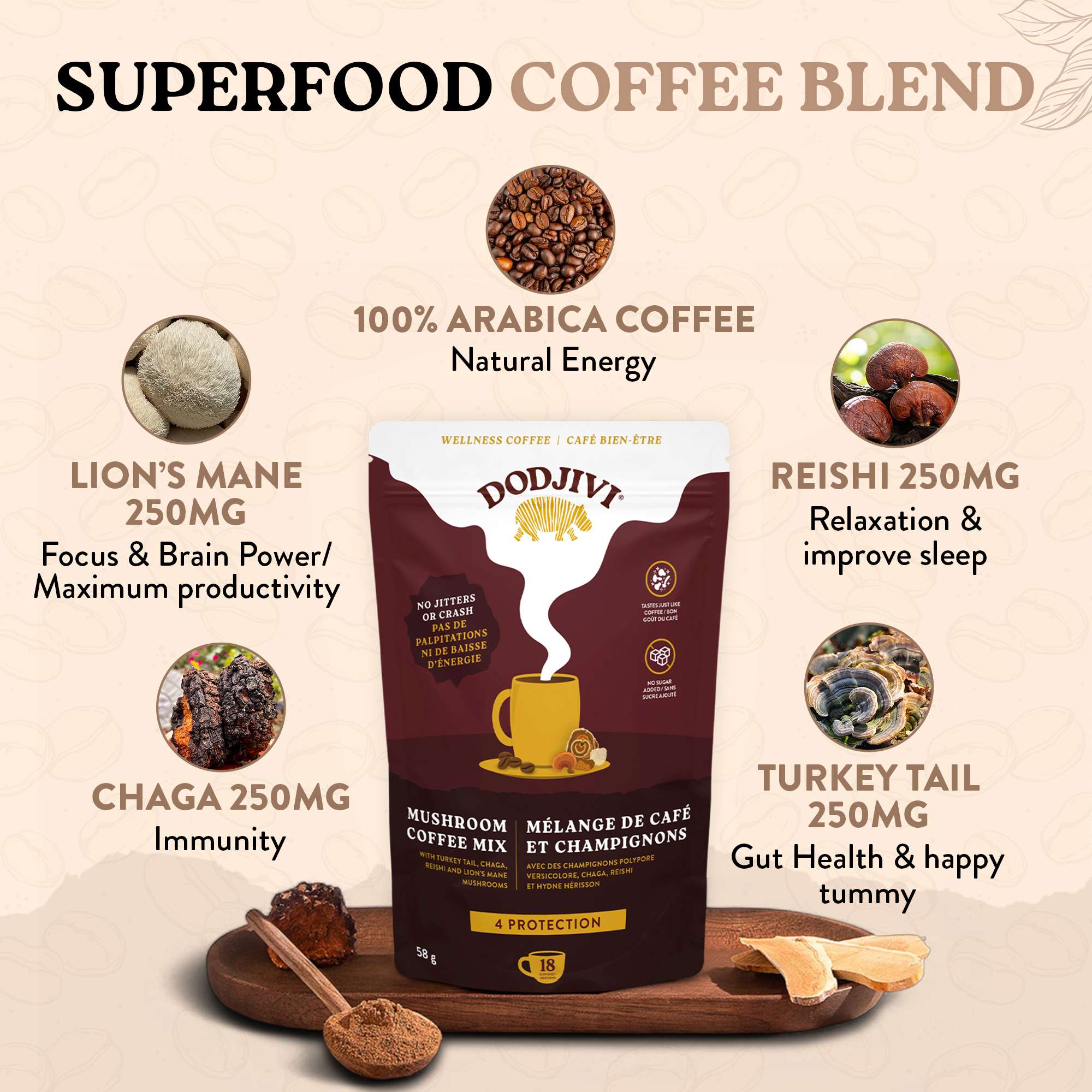 Chaque portion du mélange de café aux champignons protecteurs contient 250 mg de chacun des champignons suivants : crinière de lion, chaga, queue de dinde et reishi. Au total, chaque tasse contient 1 000 mg (soit 1 gramme !) de champignons fonctionnels.