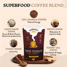 Ingrédients : Café 100 % arabica cultivé en Colombie, poudre de champignon crinière de lion biologique, poudre de champignon reishi biologique, poudre de champignon queue de dinde biologique, poudre de champignon chaga biologique.