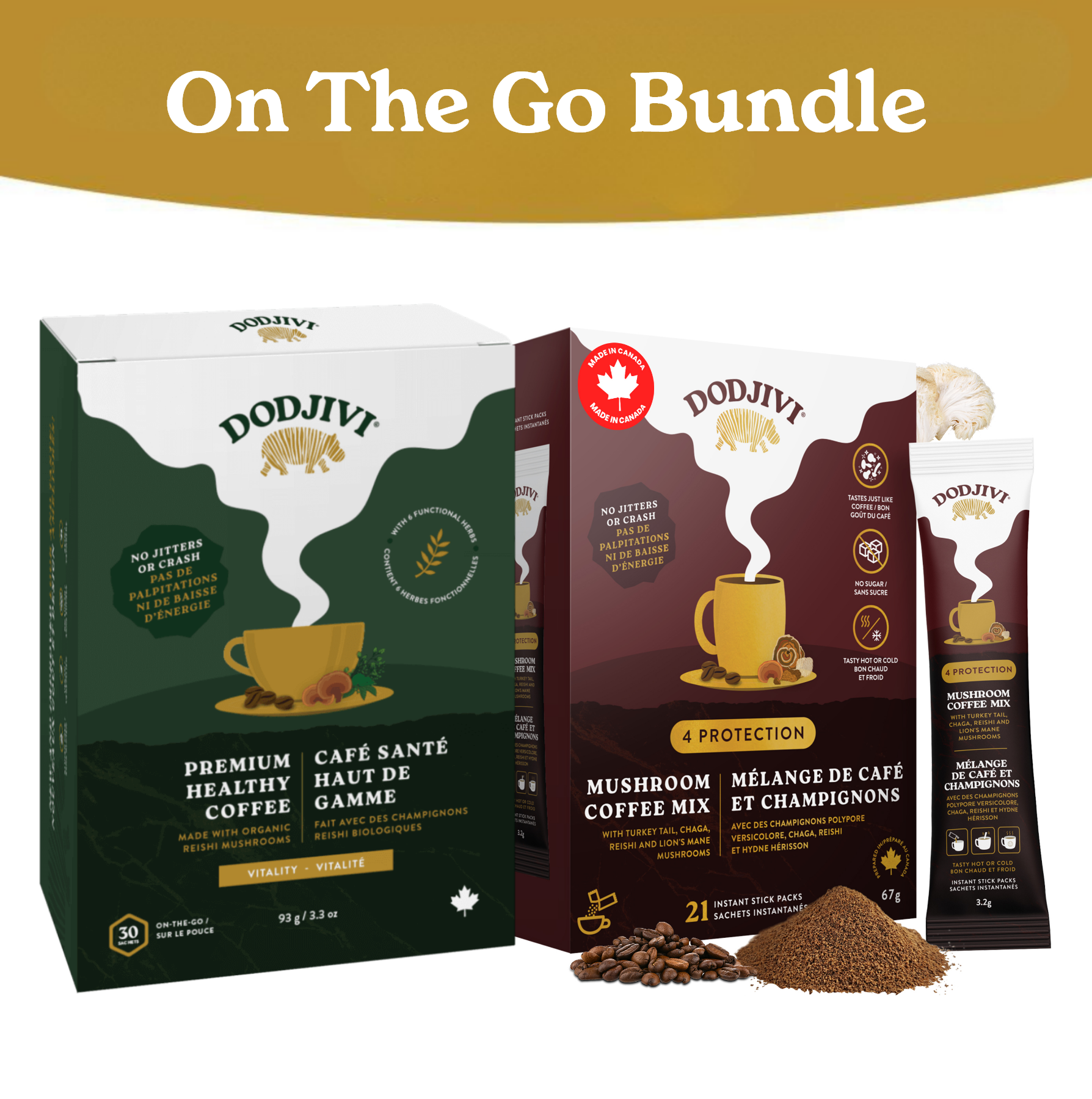 The On-the-Go Balance Bundle includes individually packaged servings of our Vitality and 4 Protection blends. It’s designed to make enjoying your mushroom coffee easy when you’re travelling, commuting, or away from home.