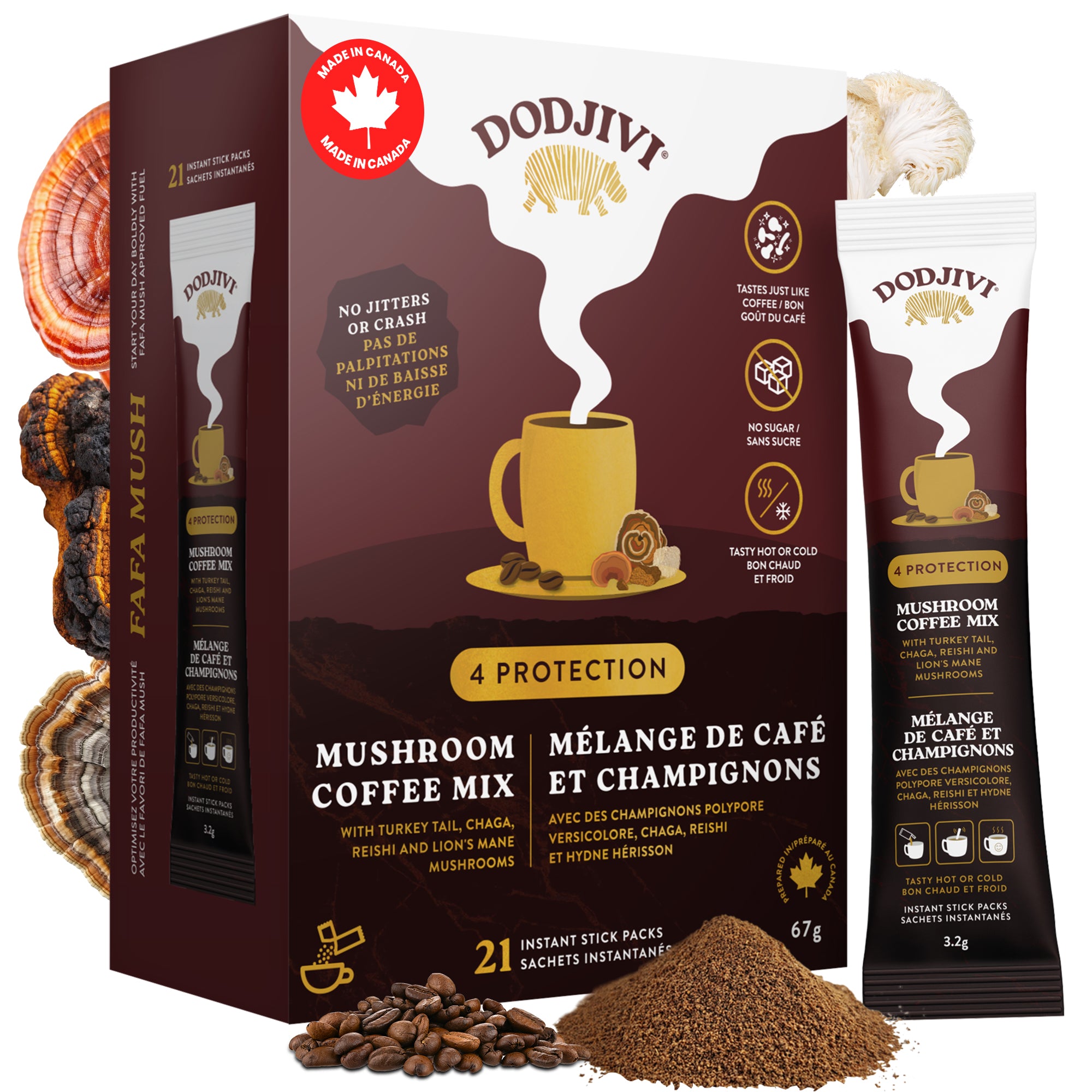 4 Protection Blend: Colombian-grown 100% arabica coffee, organic lion’s mane mushroom powder, organic reishi mushroom powder, organic turkey tail mushroom powder, organic chaga mushroom powder.